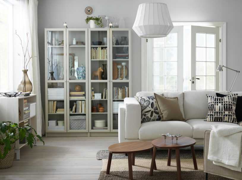 Для оформления гостиной можно выбрать один из книжных шкафов икеа. Это стеллажи со стеклянными или комбинированными дверями: