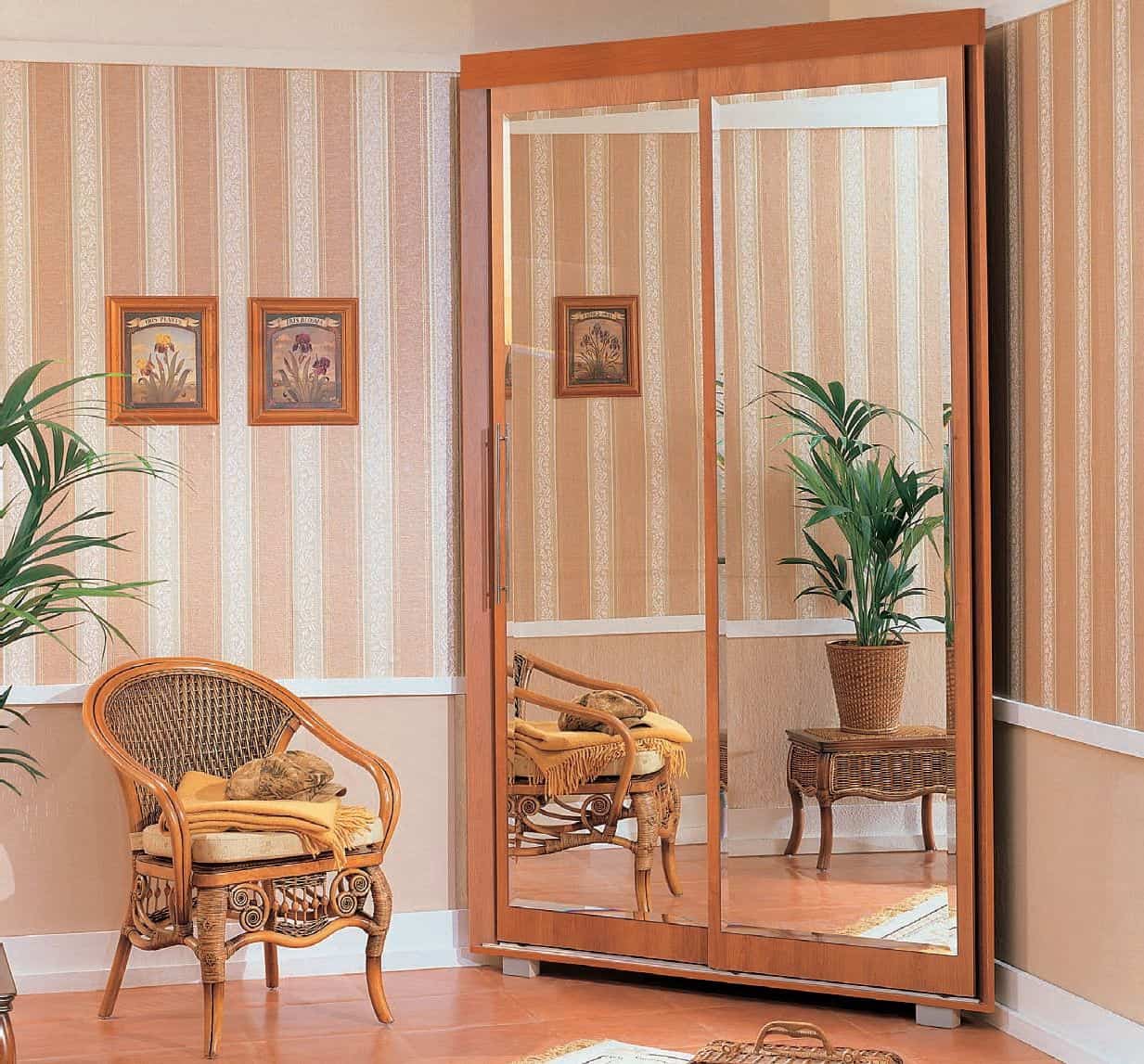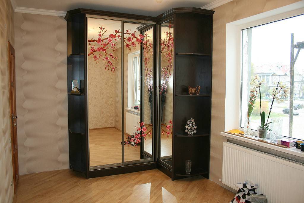 Очень популярны на угловых шкафах украшенные пескоструйными рисунками зеркала. Если площадь их велика, желательно, чтобы корпус конструкции был на несколько тонов темнее светлых обоев. В противном случае вся обстановка комнаты будет казаться невыразительной.