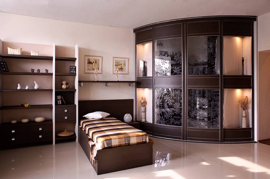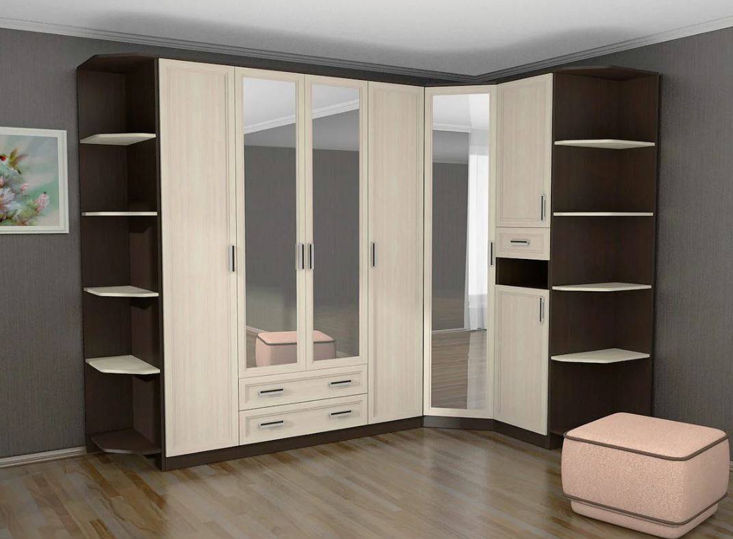 - Комбинированные — состоящие из прямолинейных, Г-образных или радиусных отсеков. Такие конструкции, как правило, изготавливаются на заказ, а потому они высокопрактичны и оригинальны. К ним можно присоединить кровать, комод, стол и таким образом создать мебельный комплекс одного стиля. Существенный недостаток (так же, как и у радиусных моделей) — высокая стоимость и сложность изготовления.