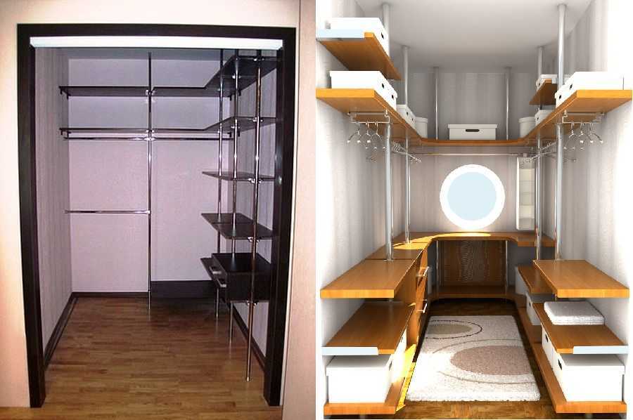 Для небольшой гардеробной в кладовке, стена которой выходит в спальню, стоит установить несколько открытых полок под сложенные вещи — джемпера, свитера, футболки и т.д. Менее громоздки и более удобны проволочные ящики или полки. Они экономят пространство, к тому же лучше видно, что в этих ящиках/полках лежит.