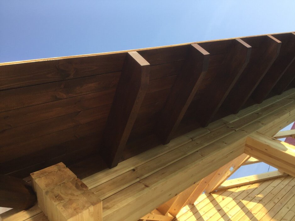 В нашем случае часть стропильной системы над домом из строганной сухой доски размером 190х70 мм, а снаружи дома из клееного бруса размера 190х70 мм. Предварительно вся стропильная система была обработана био-огнезащитным составом. Доски были пропитаны маслом в два слоя и отшлифованы в лицевой части. Свесы кровли снаружи «зашиты» имитацией «под брус», что избавило от покраски «неудобных» элементов дома.
