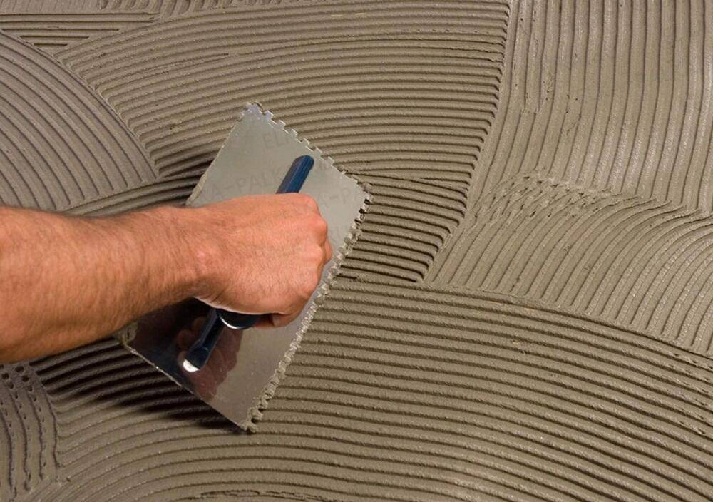 - Клей наносится равномерно обычным шпателем. После чего по клею нужно провести зубчатым шпателем.