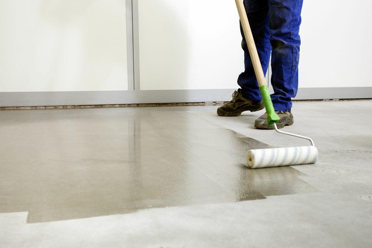 Нанесение на основание пола грунтовочного слоя, этот этап должен выполняться сразу после подготовки. Он является обязательным, поскольку обеспечивает отличное сцепление плитки с основанием, поэтому можно быть уверенным в долговечности и надежности облицовки.