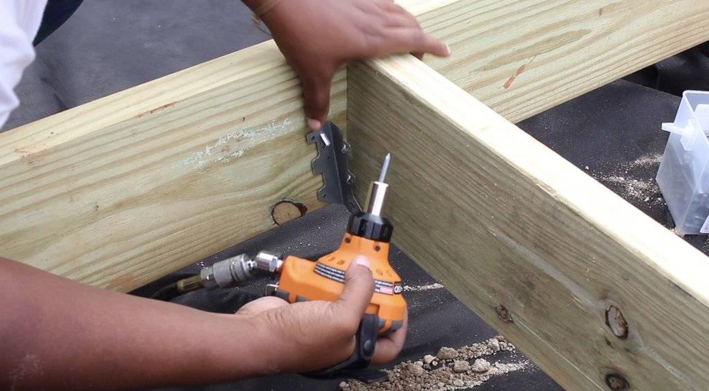 С одного края лаг надо установить специальные стартовые скобы из металла, которые крепятся к лагам саморезами (3,5х30 мм). Скоба должна немного выступать за пределы торца лаги, чтобы террасная доска точно встала с торцом в одной плоскости.