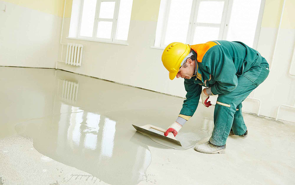 - Сначала нужно установить, в каком состоянии находится на текущий момент бетонное основание пола. Если оно имеет ощутимые неровности, каждую из них необходимо выровнять. При незначительных перепадах достаточно воспользоваться самовыравнивающейся смесью, которая превосходно справляется с такими огрехами. После подсыхания смеси поверхность пола тщательно подметается.