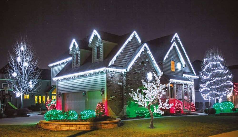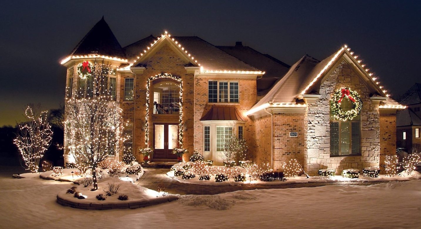 Для загородных домов такое украшение – лучший вариант. Можно, например, украсить весь фасад дома, начиная с крыши, тогда на участке будет светло и празднично.
