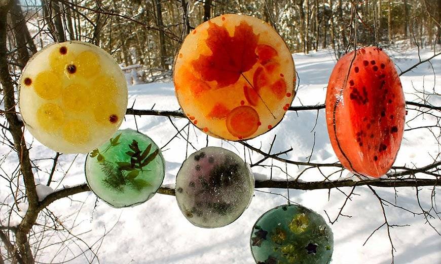 Вариации поделок изо льда – это разноцветный лед, для чего воду подкрашиваем обычными красками.