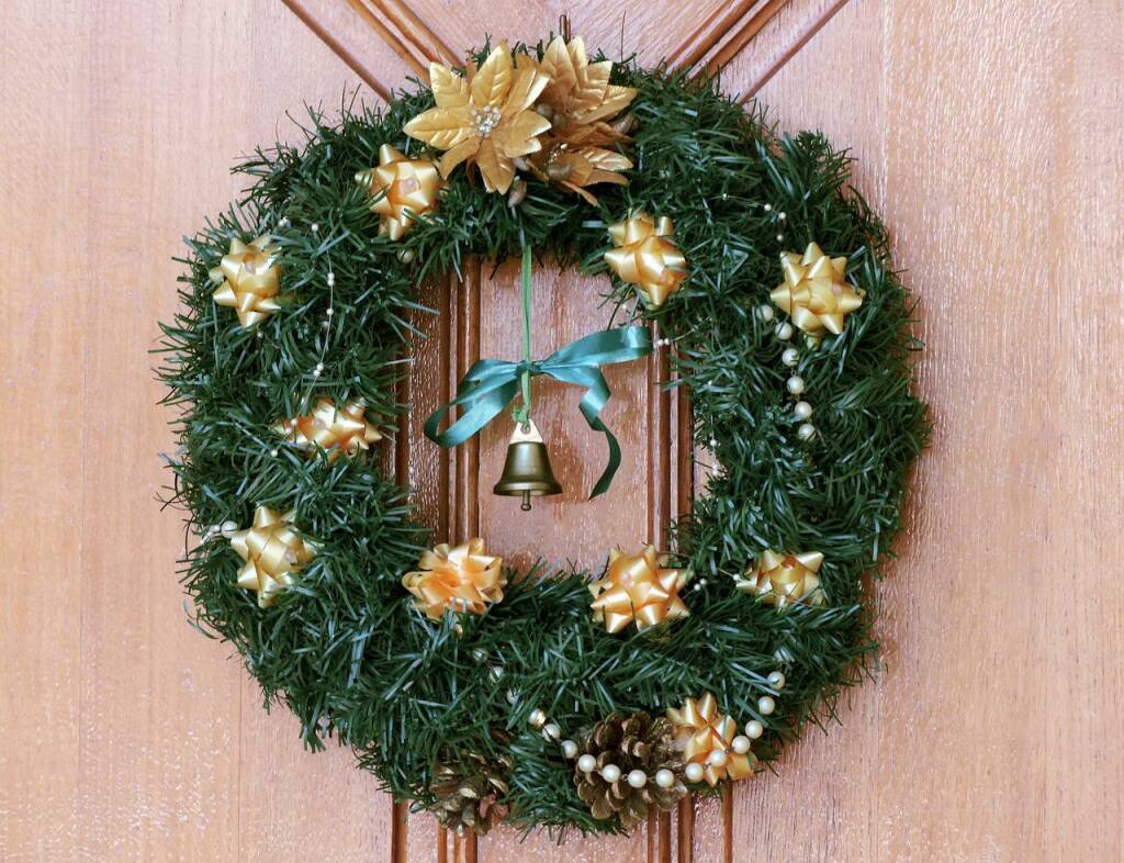 Нарядно и празднично на входной двери будет выглядеть Рождественский венок или арка из еловых веток, украшенная елочными игрушками, колокольчиками и мишурой.
