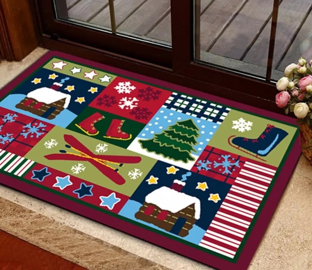 Для украшения выхода на улицу можно положить у двери праздничный коврик в новогодней тематике, сделанный своими руками.