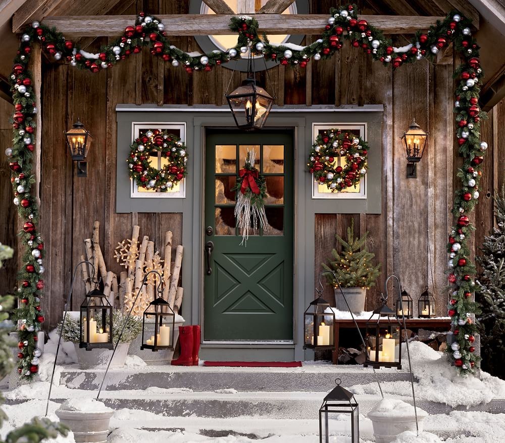 Не забудьте украсить входную дверь дома снаружи и крыльцо новогодним венком, составленным из еловых веток или множества шаров.