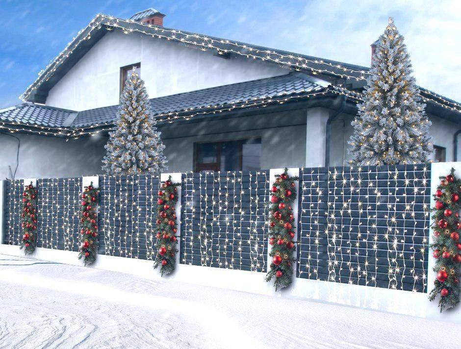 Светящаяся сетка, наброшенная на забор, станет довольно простым, но эффектным украшением.