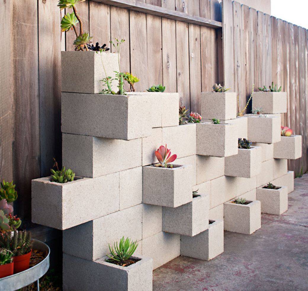 При помощи полых шлакоблоков нередко создают цветочную композицию для сада, выстроив элементы в виде пирамиды или башни, как показано на фото горшков. Придать вазонам оригинальности можно посредством покрытия поверхности изделий красками. Горшок для растений можно создать из обычной мусорной урны, которая выполнена из блестящего материала. К днищу изделия для возможности его перемещения прикрепляют вращающиеся мебельные колесики.