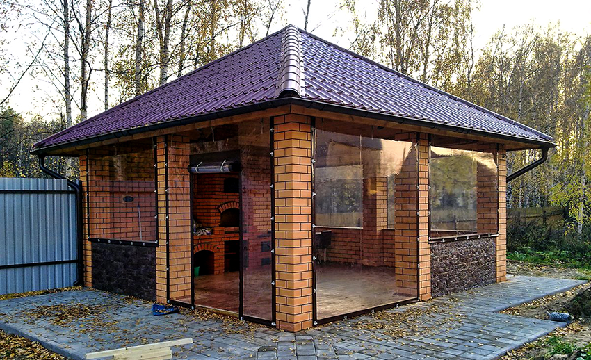 Поливинилхлоридная пленка используется круглогодично, комфортна в летний период, во время дождя, защищает от ветра. Беседка защищена, кроме дождя, еще и от снега зимой.