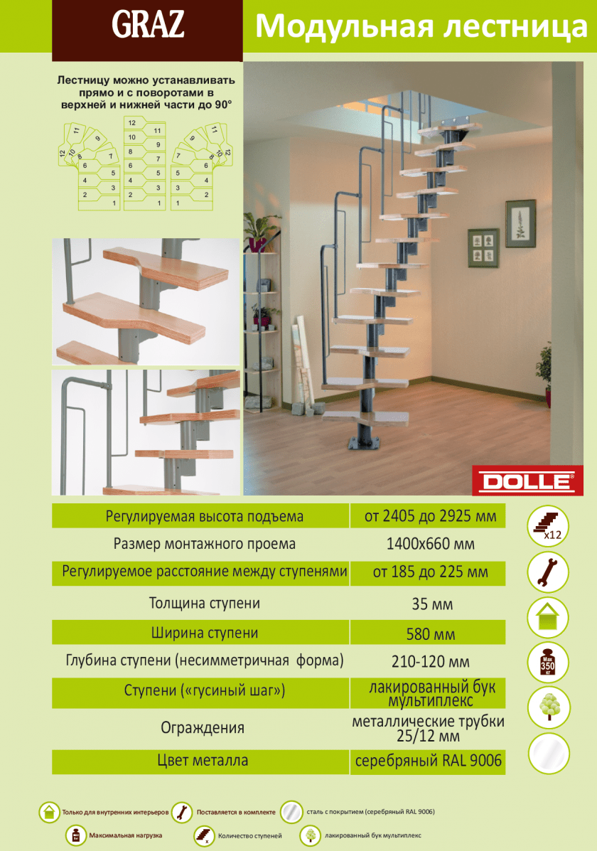 В комплекты входят все крепежные элементы для различных расстояний между полами. Как правило, силовая конструкция изготавливается из металла, а ступени — из дерева.
