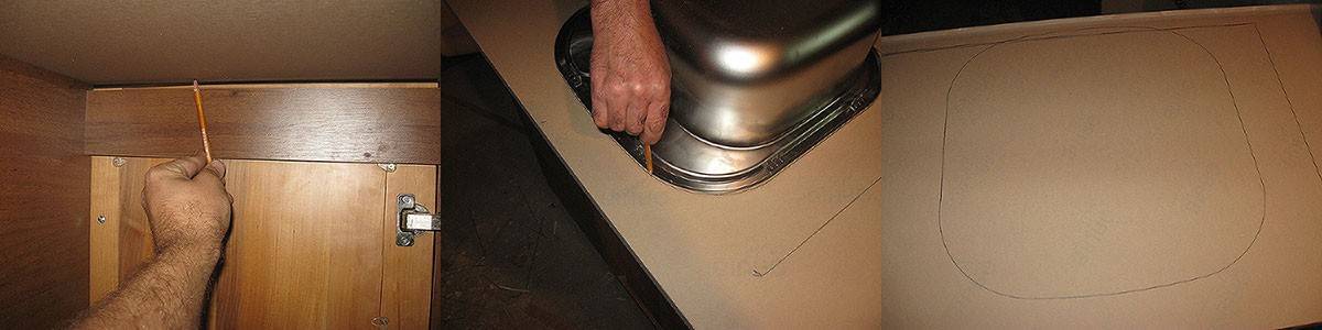 Переворачиваем мойку вниз, кладём на столешницу и обводим её