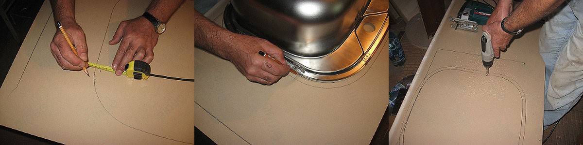 разметке выреза под мойку. Не забываем сразу наклеить уплотнитель на