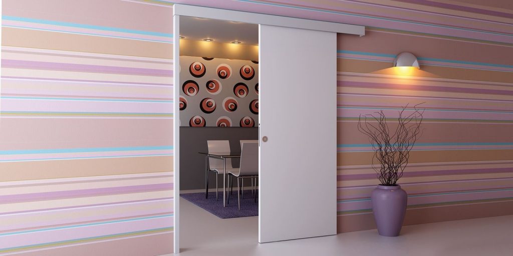 Механизм работы таких межкомнатных дверей аналогичен устройству конструкций в купейных вагонах или шкафах-купе. То есть дверца не открывается как обычно, а движется вбок — параллельно стене. Такие межкомнатные изделия отлично смотрятся в малогабаритных квартирах или домах с узкими коридорами.