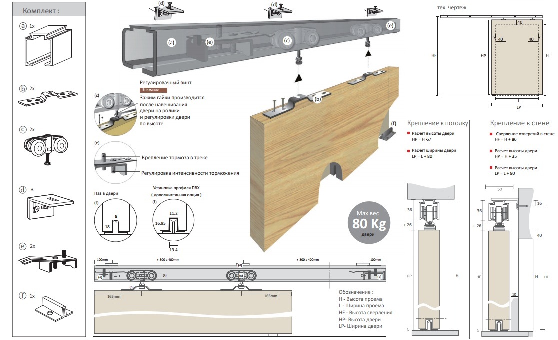 - Подвесы перемещаются по общей горизонтальной направляющей, которая монтируется над дверным проемом;
