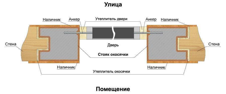 Вверху устанавливается поперечная рейка, а в зазор кладется мягкий утеплитель. Брусья по бокам наращивают досками, ширина которых равняется ширине торца. В результате этих действий получается черновая коробка, к которой будут крепить железную дверь.