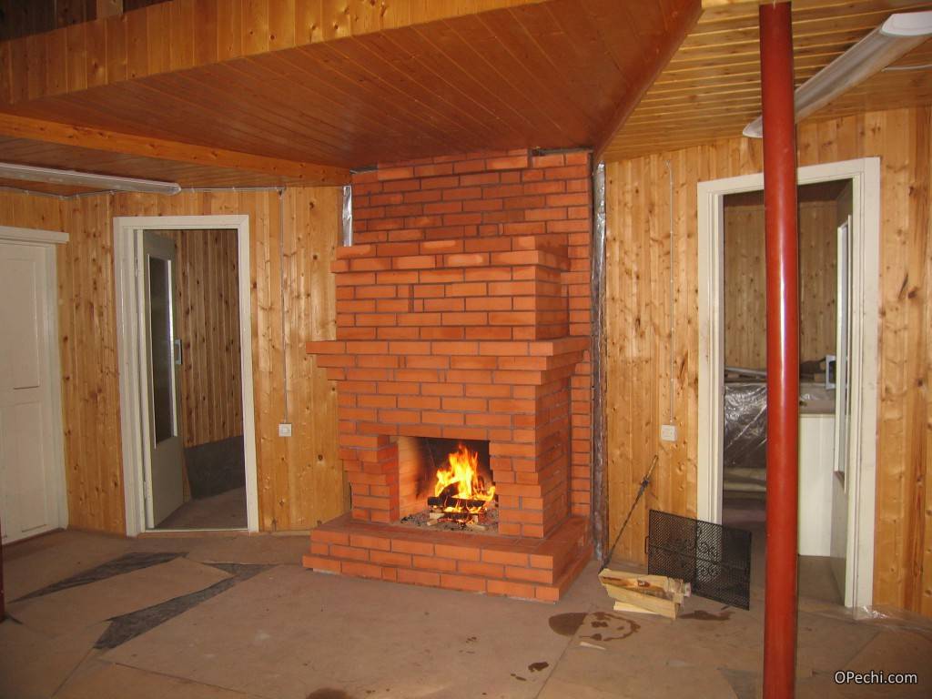 - в проеме — предусматривает схему устройства углового камина, располагаемого на стыке стен, с одновременным отоплением двух комнат;