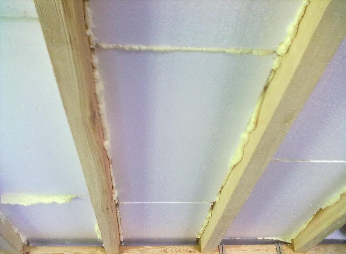 Использование пенополистирола предполагает и утепление им перекрытий. Алгоритм действий в данном случае сходен с внутренним утеплением крыши. Плиты утеплителя закладываются в промежутки потолочных балок перекрытия