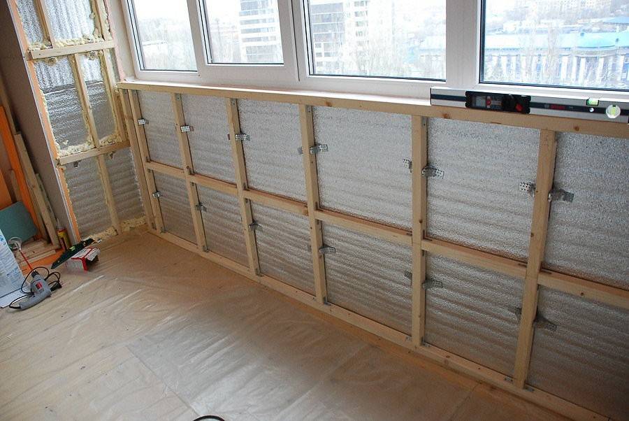 Через каждые 2,5 м нужно крепить по 2 бруска подряд. Это необходимо для последующего крепления на них гипсокартона. После фиксации всех поперечных брусков можно переходить к боковым стенам балкона.
