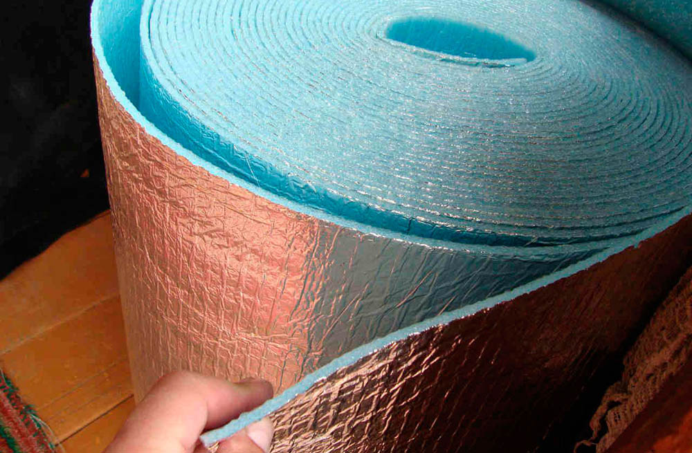 Пенофолом называют вспененный полиэтилен, покрытый с одной или обеих сторон алюминиевой фольгой. Он выпускается в рулонах толщиной от 3 до 10 мм, на стыках соединяется алюминиевым скотчем. Материал отлично заглушает звуки и совсем не пропускает влагу, но имеет не самые высокие термоизоляционные свойства. Для большей эффективности, его укладка производится вместе с другим утеплителем, например, пенополистирольными плитами.