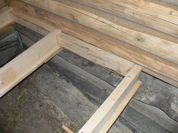 Сначала нужно подготовить либо купить готовые лаги специальной Т-образной формы. Они устанавливаются на фундамент либо же закрепляются путем врубки в деревянный сруб. Элементы следует размещать на расстоянии в 60-95 см друг от друга.