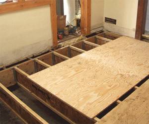 Настилание чистового пола. Выбор определяется типом финишной отделки. Для линолеума, паркета и ковролина лучше брать недорогие листы водостойкой фанеры толщиной 16-25 мм. Массивную доску можно укладывать сразу на каркас. При этом следует брать рейки с выбранными краями, чтобы в поверхности отсутствовали сквозные щели.