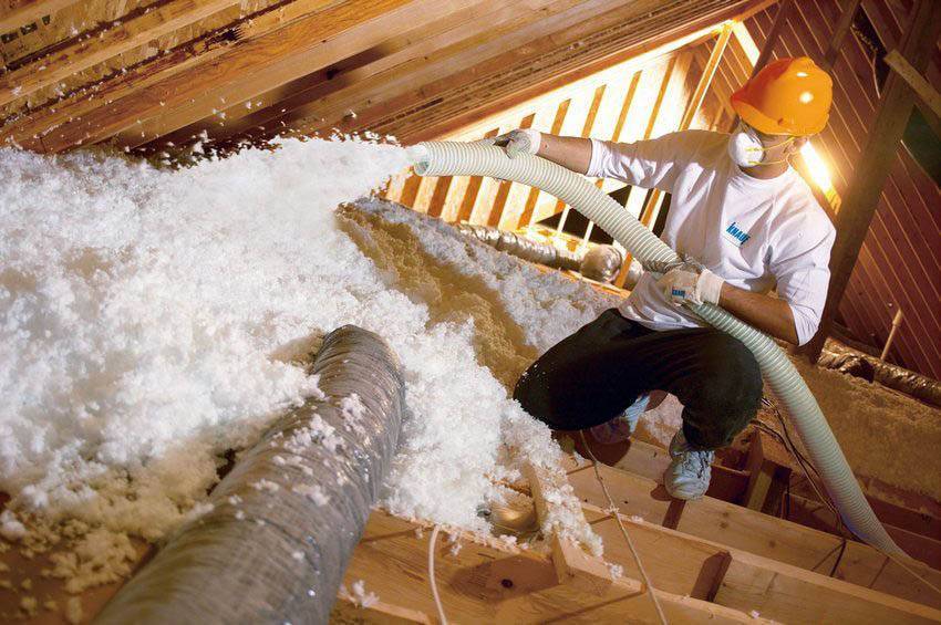 Преимущества эковаты для теплоизоляции потолка заключаются в низкой цене, высоких утепляющих качествах, безвредности при эксплуатации. Стандартный удельный вес утеплителя составляет 14-20 кг/м³ .