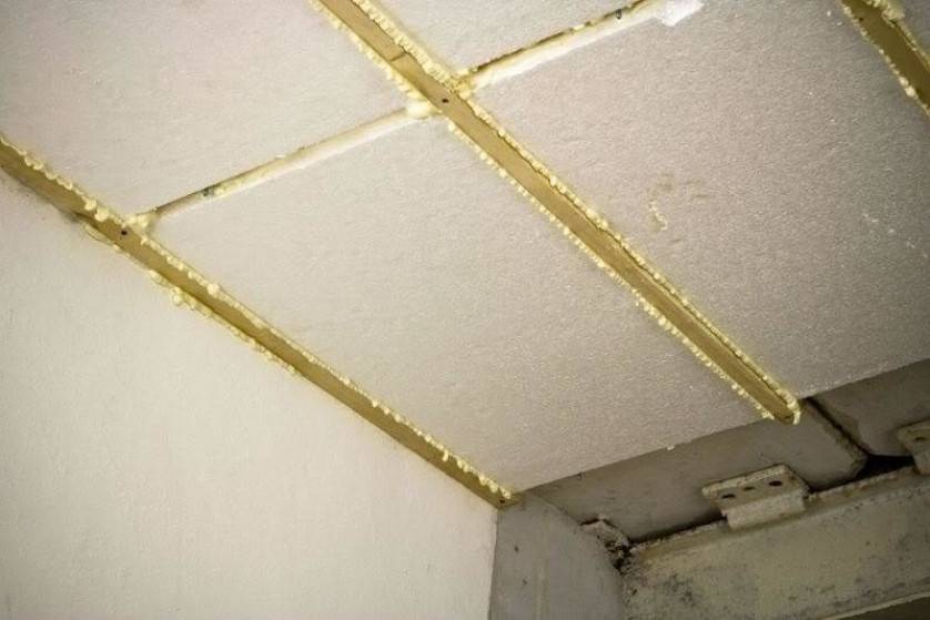 Сделать это можно следующим образом: клеящий состав наносим на лист теплоизолирующего материала, а затем плотно прижимаем его к потолку. В качестве клея можно использовать «жидкие гвозди», монтажную пену, либо клей на цементной основе (замешивается по инструкции и наносится шпателем точечно, объемными нашлепками).