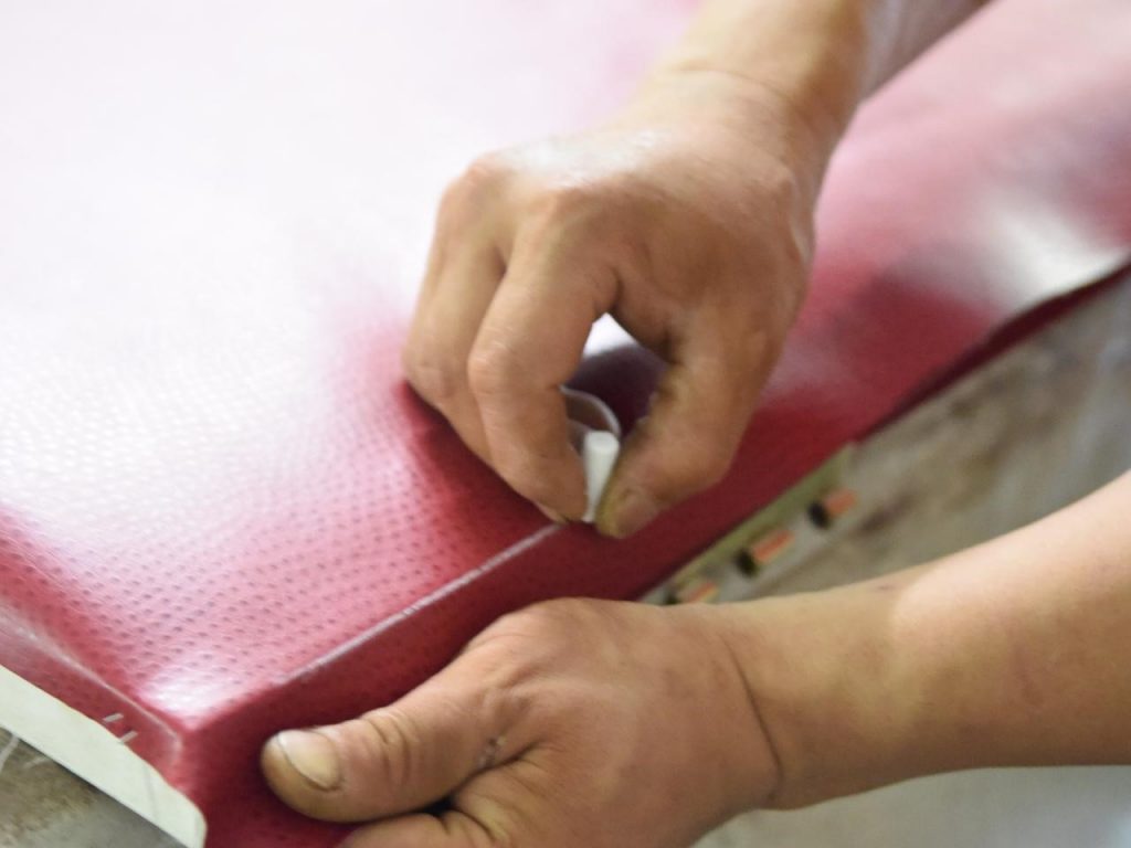 - Для отделки одной стороны пенопласт следует вырезать так, чтобы его размеры были идентичным основе, затем материал обшивается дермантином и приклеивается на жидкие гвозди.