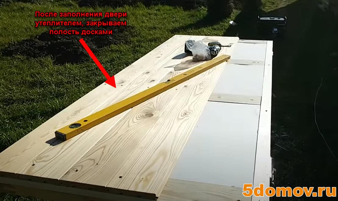 - Также хозяин можно прибить деревянные рейки вдоль периметра коробки. Получившуюся область следует заполнить пенопластом, после чего конструкцию можно обшить вагонкой. Толщина рейки должна соответствовать пенопласту. Но этого способа есть минус: конструкция прибавляет в весе и появляется необходимость в дополнительных петлях.