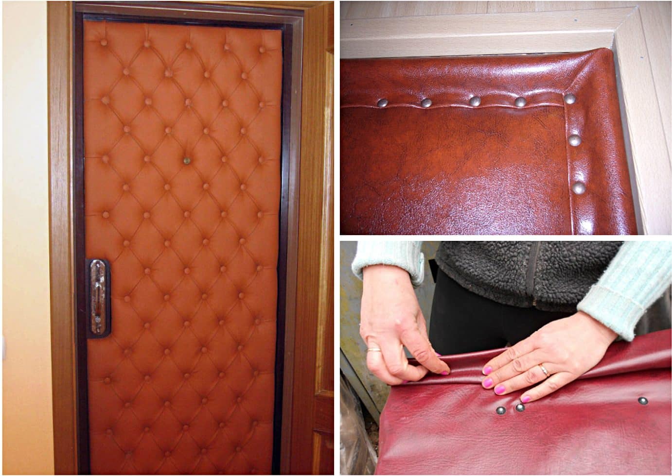 Используется материал толщиной до 1-го см. Им двери утепляют изнутри помещения. Далее поролоновый утеплитель закрывают обшивкой, закрепляя декоративными гвоздями. Декоративной обшивкой служат: