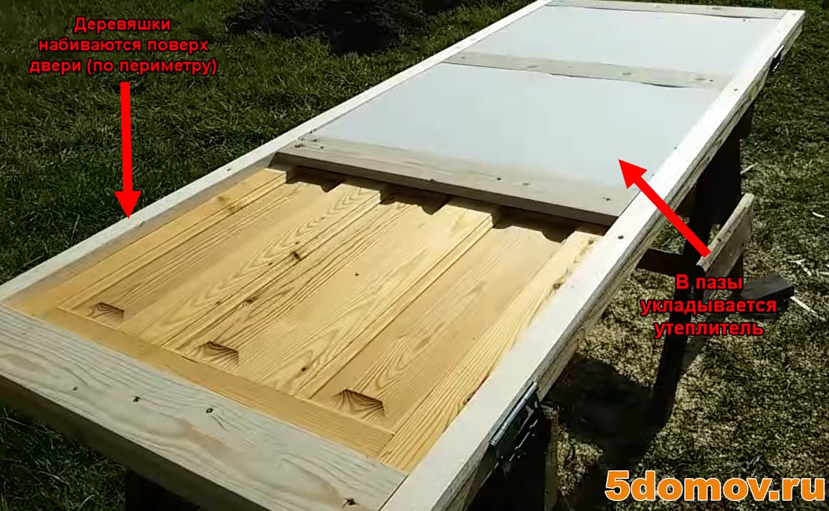 Второй способ заключается в прибивании своими руками по периметру коробки деревянной рейки. В образовавшееся пространство вкладывается пенопласт, и конструкция обшивается вагонкой или другим подходящим материалом. Толщина рейки должна быть такой же, как и у пенопласта. Но такой вариант утепления имеет один недостаток. Вес конструкции увеличится, и могут потребоваться дополнительные петли.