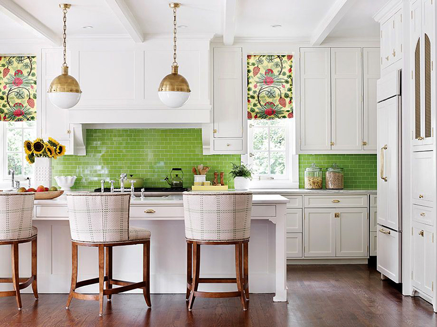 - Белый – часто он является главенствующим на кухне, поэтому его стоит разбавить яркими акцентами из текстиля и аксессуаров, чтобы избавить пространство от безликости.