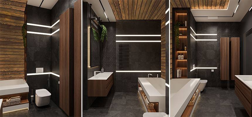 Брутальная ванная комната в стиле минимализма обыгрывает отделку вагонкой за счёт подсветки ниш и линий освещения. Горизонтальные рейки на стене переходят на потолок, и этот приём гармонизирует пространство. Сочетание с угольной плиткой смещает акцент на текстуру дерева.