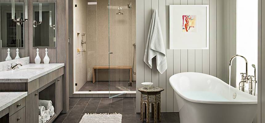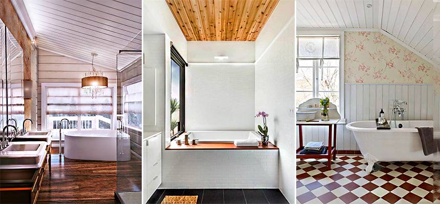 Монтаж вагонки на потолке не акцентирует внимание, и при этом подчёркивает строгую красоту. Изысканная текстура древесины, подсвеченная потолочными светильниками, органично сочетается с плиткой, и это ещё раз доказывает невероятные возможности обычных плашек.
