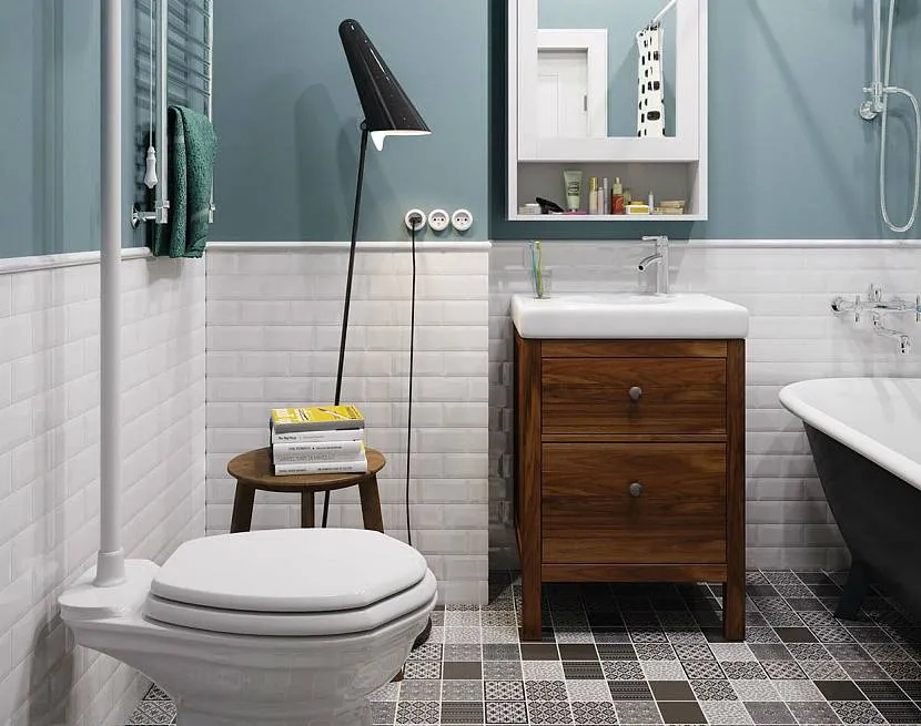 – Эклектичность отделочных материалов. Чтобы дизайн интерьера не выглядел излишне аскетично, можно сочетать несколько вариантов оформления на одной поверхности. Один из вариантов – интерьер со стилизацией под финскую баню: стена частично обшита горизонтальными досками светлого дерева, другая половина декорирована кафелем с имитацией кирпичной кладки. Еще одно решение – мозаичное панно над раковиной, сверху – зеркальная панель, раздвигающая границы помещения.