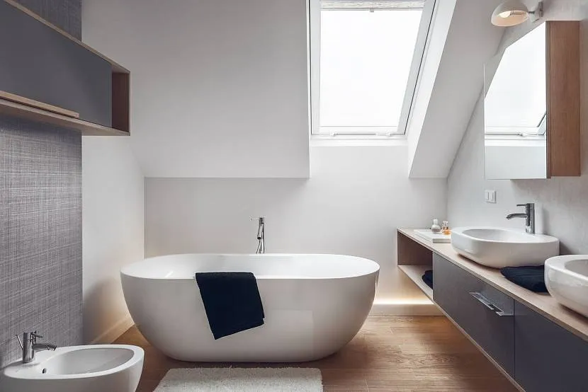 Ванна должна быть размещена на деревянной или имитирующей дерево поверхности. Такая комбинация прекрасно подчеркнет минималистский характер интерьера.