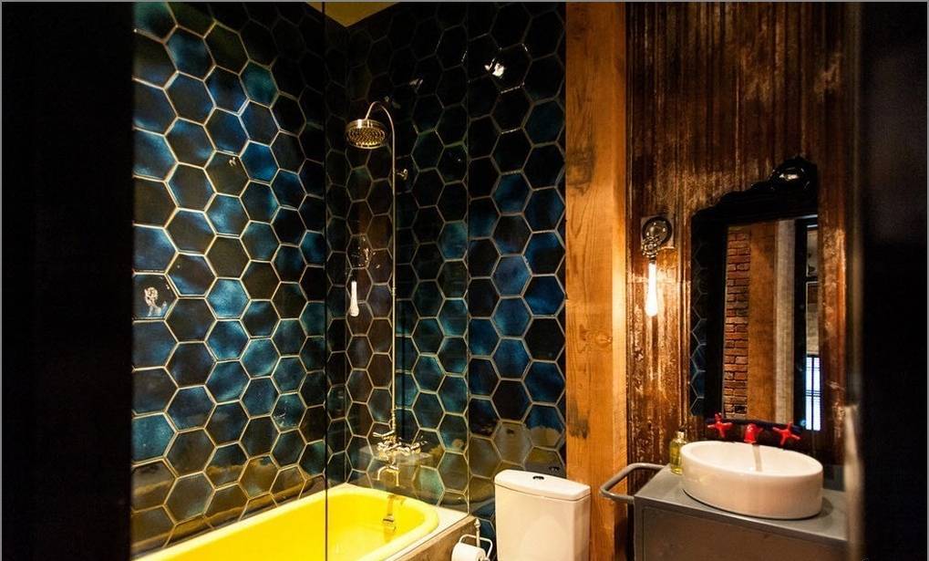 Броская плитка в форме пчелиных сот появилась в центре внимания маленькой ванной помещения с поразительно яркой желтой ванной. В соседстве с древесными поверхностями разных пород древесины, интерьер оказался эклектичным и насыщенным.