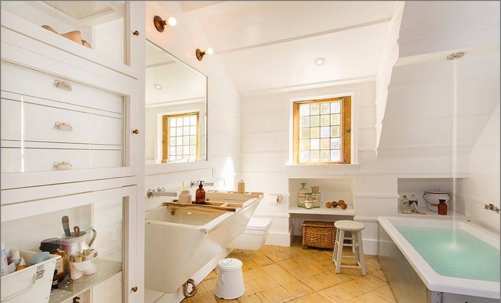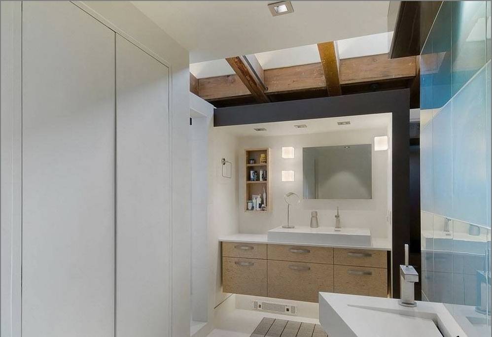 В санузле чаще всего встречается потолок белого цвета, наделяющий комнату большим простором. Добавить незавершенности такой потолочной плоскости и сформировать атмосферу чердачного помещения, помогут деревянные балки. Отделывать пол можно ламинатом, половыми досками, керамогранитом или оформить наливную плоскость из бетона.
