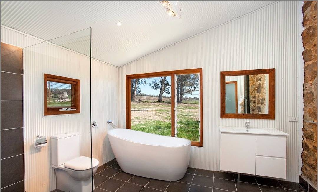 Явным признаком такого дизайна ванной будет старомодный душ с широкой лейкой, «состаренные» или окрашенные в черный или медный цвет трубы. Старая мебель из плохо обработанного дерева, черные металлические стеллажи служащие для хранения полотенец и ванных принадлежностей.