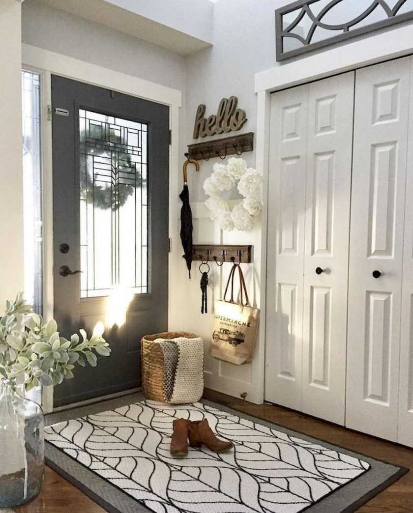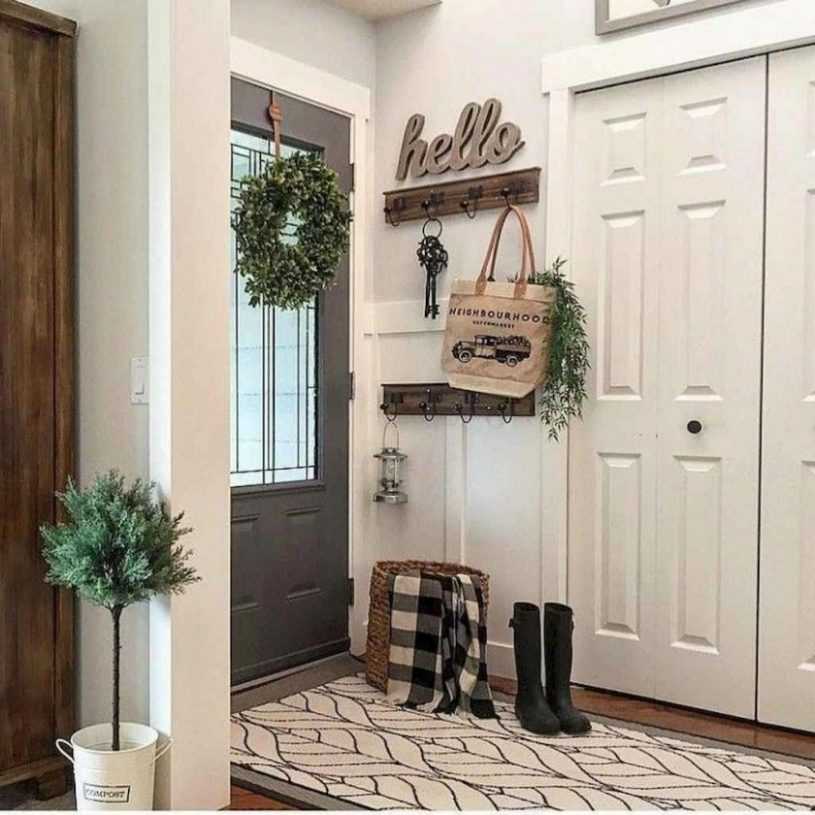 Кантри. При входе создается впечатление уютного деревенского домика. При создании деревенского колорита, отделочные материалы желательно использовать только натуральные, в кремовых, жемчужных и оливковых цветах. Стены оформляются деревянными панелями в сочетании с декоративной штукатуркой или обоями стилизованные под натуральные природные фактуры. Пол из паркетной доски и деревянная мебель с элементами плетения. Ярким акцентом в интерьере может стать коврик под ногами и накидка на скамейку для обувания, ручной работы.