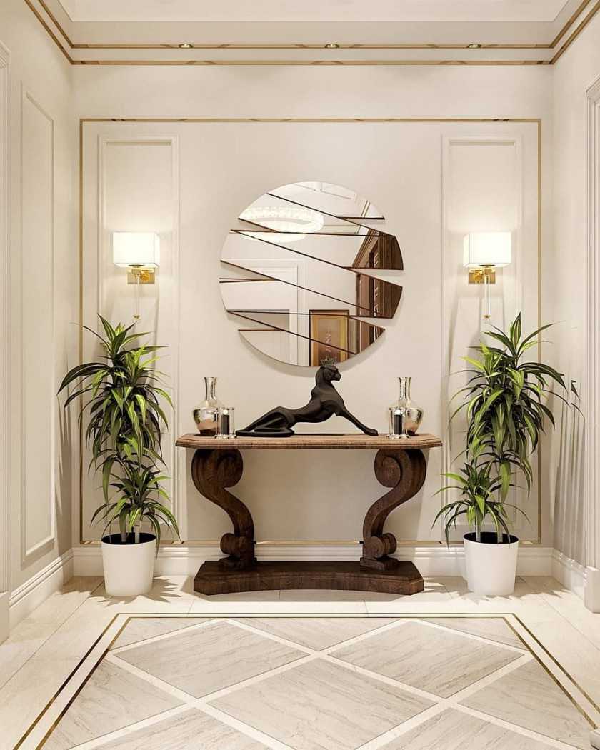 Классическая прихожая белого цвета с тумбой и зеркалами