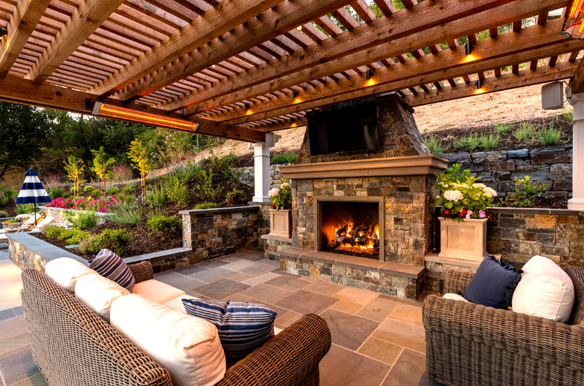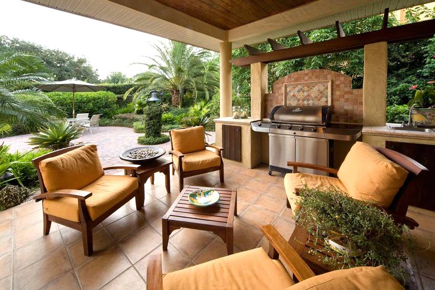 - Летняя кухня с террасой. Условно разделена на две части. Зону приема пищи иногда обустраивают без стен и крыши. Часто размещают в саду, под деревьями, чтобы спрятаться от солнца.
