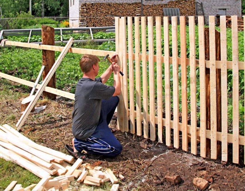 Но принцип построения всех их один и тот же. К закопанным столбам прибиваются либо продольные доски, либо деревянные плиты (щиты). Наиболее распространён вариант с двумя или тремя перекладинами, к которым потом прибиваются вертикально либо штакетник, либо другие детали, заготовленные для данной цели.