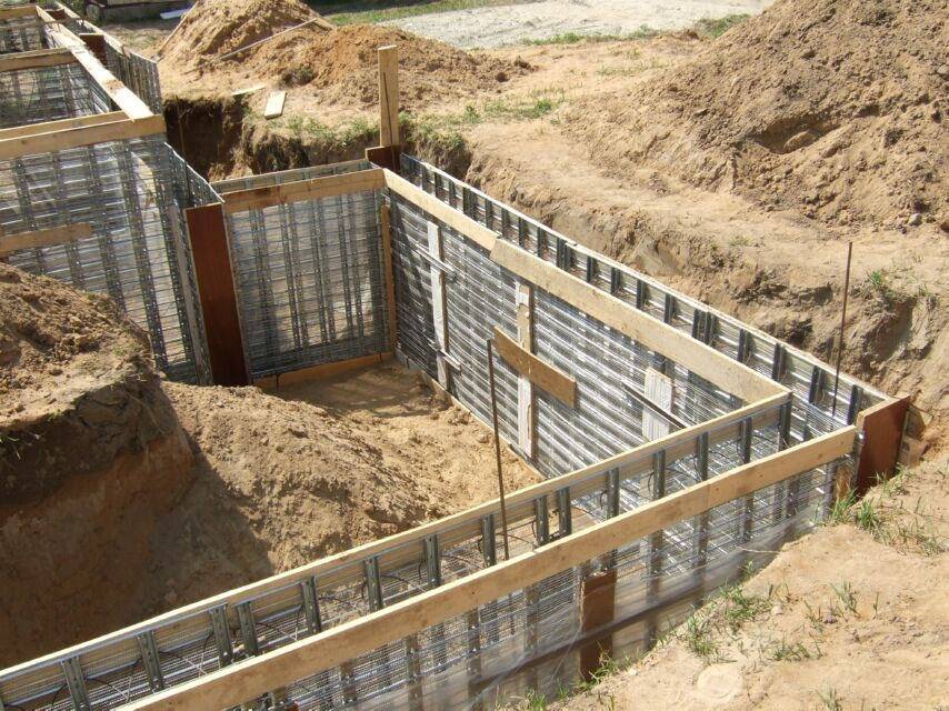 Чаще всего для создания каркаса ленточного фундамента используется арматура. Ее монтируют на стадии установки опалубки, а затем послойно заливают бетон и выполняют гидроизоляцию, используя рубероид и мастику.