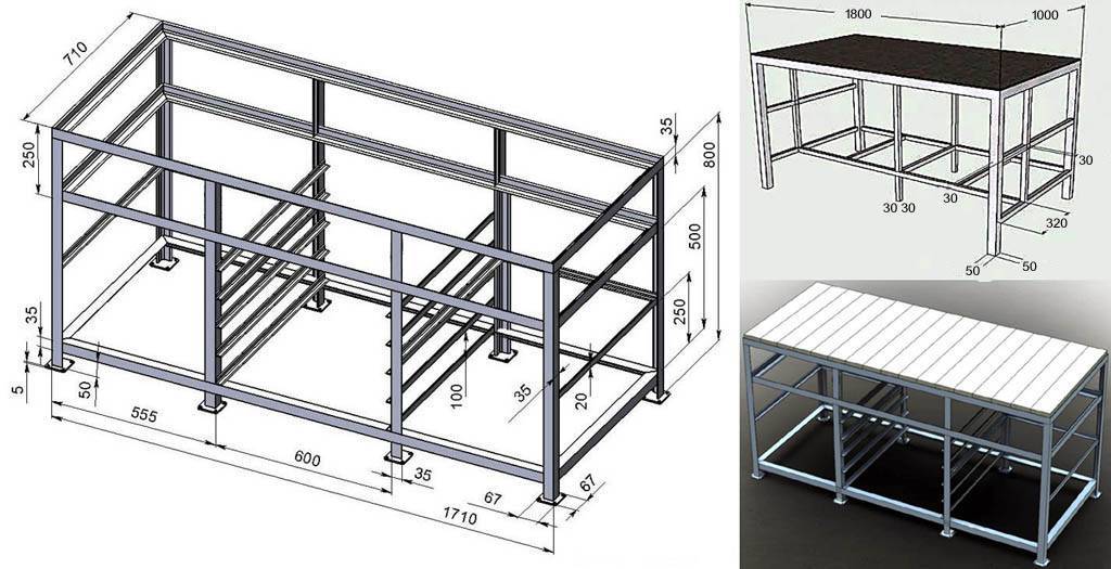 Бывает наоборот: металл доступнее дерева, и сварка есть. Тогда стол-верстак под нагрузку 100/300 кгс можно собрать по чертежу слева на рис. Материалы – уголок 35х35х3 и 20х20х2. Ящики – из оцинковки. Недостаток – нельзя сделать проем внизу для ног, конструкция потеряет способность нести динамическую нагрузку.