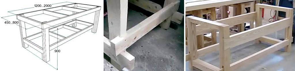 Подобным образом собирают 2 рамные конструкции, которые затем соединяют царгами. Они представляют собой две планки шириной не менее 100 мм. Соединять их с ножками можно как вполдерева, так и внакладку с помощью болтовых соединений. Основная задача — выдержать прямые углы и обеспечить параллельность всех деталей.